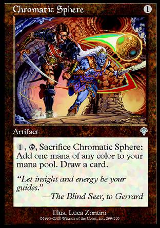 : 1, T, Sacrifice Chromatic Sphere: Add one mana of any color to your mana pool. Draw a card.
