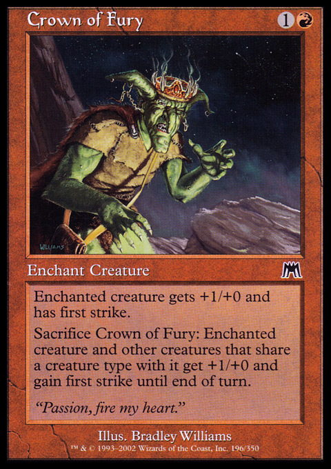 Name: Crown of Fury Rarity: Common Set: Onslaught [ONS] Attack: 0 Defense: 0 Cost: Type: Enchantment Sub-Type: Aura Rules: Enchant creature Enchanted creature gets +1/+0 and has first strike. Sacrifice Crown of Fury: Enchanted creature and other creatures that share a creature type with it get +1/+0 and gain first strike until end of turn. Price: 0.04