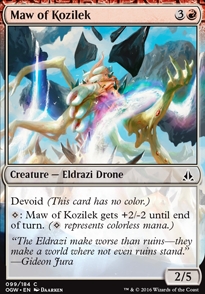 Name: Maw of Kozilek Rarity: Common Set: Oath of the Gatewatch [OGW] Attack: 2 Defense: 5 Cost: Type: Creature - Eldrazi Drone Sub-Type: Rules: Devoid (This card has no color.)ВЈ{C}: Maw of Kozilek gets +2/-2 until end of turn. ({C} represents colorless mana.) Price: 0.03