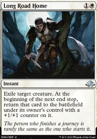 Name: Long Road Home Rarity: Uncommon Set: Eldritch Moon [EMN] Attack: 0 Defense: 0 Cost: Type: Instant Sub-Type: Rules: Exile target creature. At the beginning of the next end step, return that card to the battlefield under its owner's control with a +1/+1 counter on it. Price: 0.03