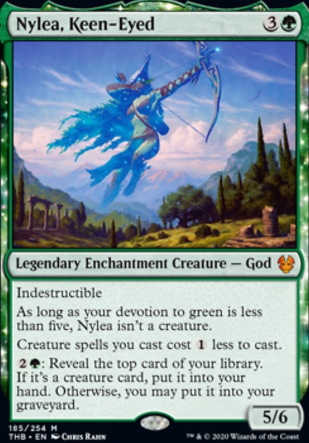 Name: Nylea, Keen-Eyed Rarity: Mythic Set: Theros Beyond Death [THB] Attack: 5 Defense: 6 Cost: Type: Legendary Enchantment Creature - God Sub-Type: Rules: Indestructible As long as your devotion to green is less than five, Nylea isn't a creature. Creature spells you cast cost {1} less to cast. {2}{G}: Reveal the top card of your library. If it's a creature card, put it into your hand. Otherwise, you may put it into your graveyard. Price: 0.03